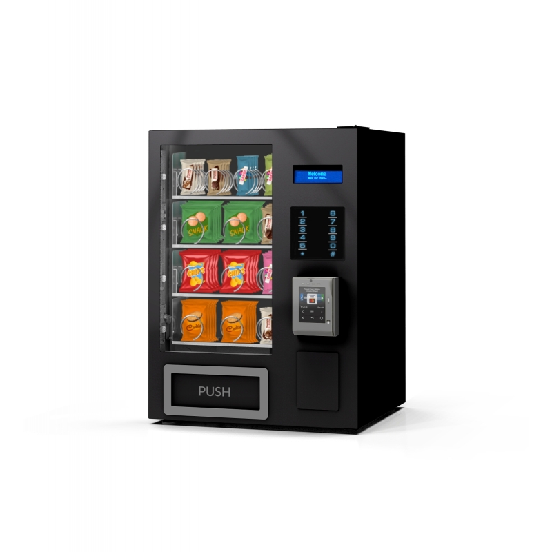 SnackUNO est le distributeur automatique de comptoir le plus compact, le plus fiable et le plus flexible de SandenVendo ; disponible en monochrome noir ou blanc
