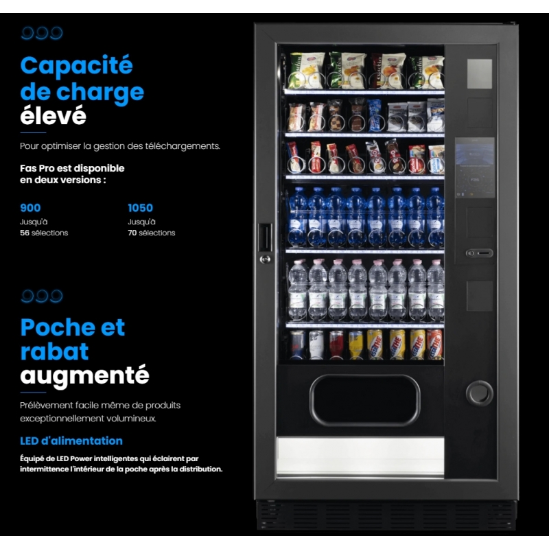 Distributeurs automatiques à spirales réfrigérés à 3°C pour boissons, snacks et aliments.